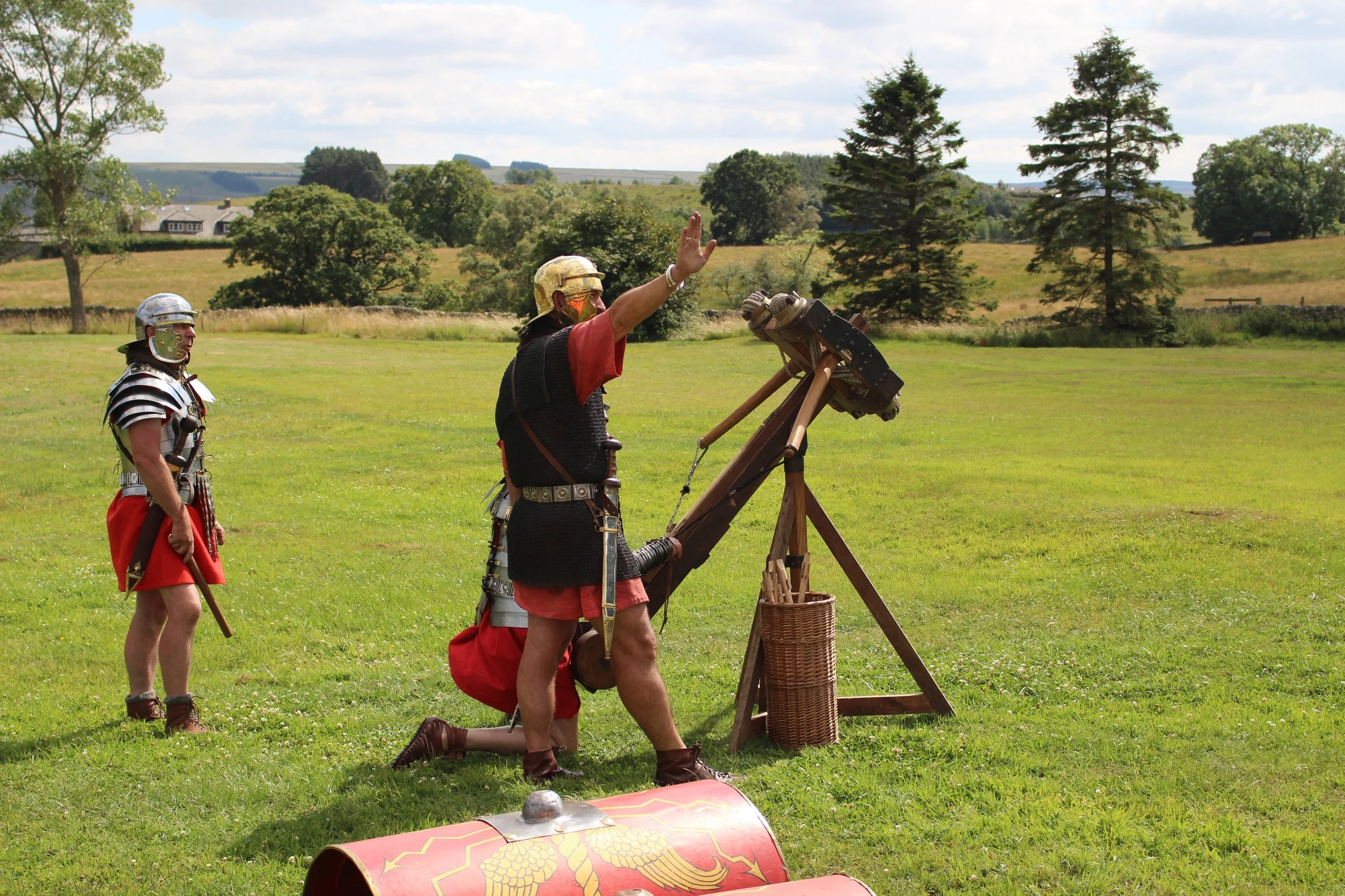 The Catapulta shot large arrows or bolts at the enemy and could be mounted on carts for mobility. One would be assigned to each century. The name comes from the Greek (katapeltes) because it could pierce (kata) a shield (pelta).